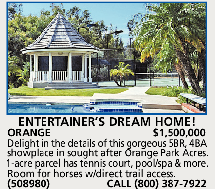 ENTERTAINER’S DREAM HOME! ORANGE $1,500,000 Delight in the details of this gorgeous 5BR, 4BA showplace in sought after Orange Park Acres. 1-acre parcel has tennis court, pool/spa & more. Room for horses w/direct trail access. (508980) CALL (800) 387-7922