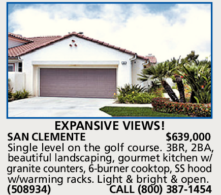 SAN CLEMENTE $639,000 Single level on the golf course. 3BR, 2BA, beautiful landscaping, gourmet kitchen w/ granite counters, 6-burner cooktop, SS hood w/warming racks. Light & bright & open.