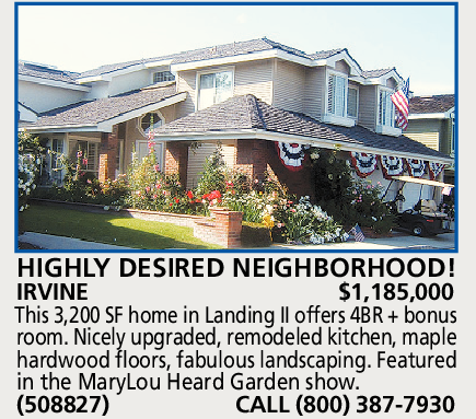 HIGHLY DESIRED NEIGHBORHOOD! IRVINE $1,185,000 This 3,200 SF home in Landing II offers 4BR + bonus room. Nicely upgraded, remodeled kitchen, maple hardwood floors, fabulous landscaping. Featured in the MaryLou Heard Garden show. (508827) CALL (800) 387-7930