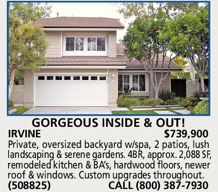 IRVINE $739,900 Private, oversized backyard w/spa, 2 patios, lush landscaping & serene gardens. 4BR, approx. 2,088 SF, remodeled kitchen & BA’s, hardwood floors, newer roof & windows. Custom upgrades throughout. (508825) CALL (800) 387-7930