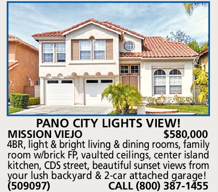 MISSION VIEJO $580,000 4BR, light & bright living & dining rooms, family room w/brick FP, vaulted ceilings, center island kitchen, CDS street, beautiful sunset views from your lush backyard & 2-car attached garage! (509097) CALL (800) 387-1455