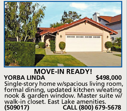YORBA LINDA $498,000 Single-story home w/spacious living room, formal dining, updated kitchen w/eating nook & garden window. Master suite w/ walk-in closet. East Lake amenities. (509017) CALL (800) 679-5678