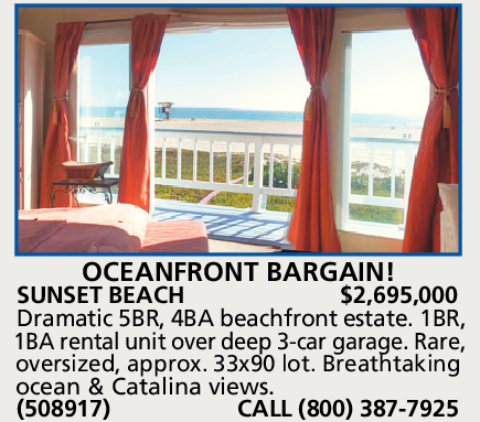 SUNSET BEACH $2,695,000 Dramatic 5BR, 4BA beachfront estate. 1BR, 1BA rental unit over deep 3-car garage. Rare, oversized, approx. 33x90 lot. Breathtaking ocean & Catalina views. (508917) CALL (800) 387-7925