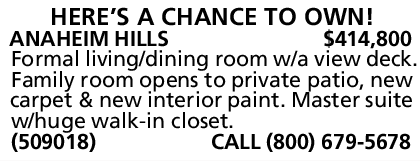 ANAHEIM HILLS $414,800 Formal living/dining room w/a view deck. Family room opens to private patio, new carpet & new interior paint. Master suite w/huge walk-in closet. (509018) CALL (800) 679-5678