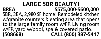 BREA $575,000-$600,000 5BR, 3BA, 2,980 SF home! Remodeled kitchen w/granite counters & eating area that opens to the large family room w/FP. Living room w/FP, yard w/pool, spa & covered patio. (508668) CALL (800) 387-5417