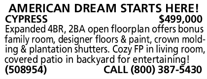 CYPRESS $499,000 Expanded 4BR, 2BA open floorplan offers bonus family room, designer floors & paint, crown molding & plantation shutters. Cozy FP in living room, covered patio in backyard for entertaining! (508954) CALL (800) 387-5430