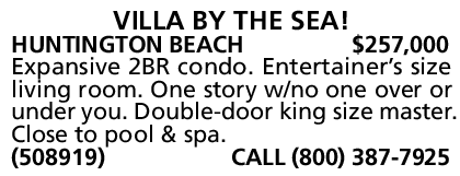 HUNTINGTON BEACH $257,000 Expansive 2BR condo. Entertainer’s size living room. One story w/no one over or under you. Double-door king size master. Close to pool & spa. (508919) CALL (800) 387-7925