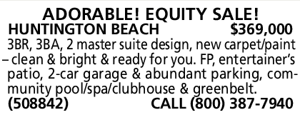 HUNTINGTON BEACH $369,000 3BR, 3BA, 2 master suite design, new carpet/paint – clean & bright & ready for you. FP, entertainer’s patio, 2-car garage & abundant parking, community pool/spa/clubhouse & greenbelt.