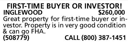 INGLEWOOD $260,000 Great property for first-time buyer or investor. Property is in very good condition & can go FHA.