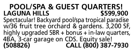 LAGUNA HILLS $599,900 Spectacular! Backyard pool/spa tropical paradise w/36 fruit tree orchard & gardens. 3,200 SF, highly upgraded 5BR + bonus + in-law quarters, 4BA, 3-car garage on CDS. Equity sale! (508826) CALL (800) 387-7930