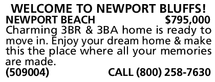 NEWPORT BEACH $795,000 Charming 3BR & 3BA home is ready to move in. Enjoy your dream home & make this the place where all your memories are made. (509004) CALL (800) 258-7630