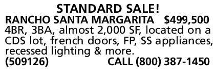 RANCHO SANTA MARGARITA $499,500 4BR, 3BA, almost 2,000 SF, located on a CDS lot, french doors, FP, SS appliances, recessed lighting & more. (509126) CALL (800) 387-1450