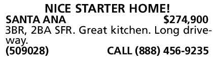 SANTA ANA $274,900 3BR, 2BA SFR. Great kitchen. Long driveway. (509028) CALL (888) 456-9235