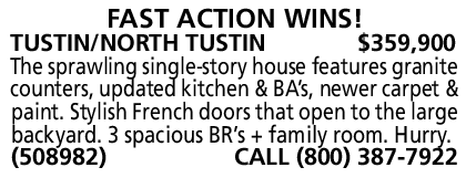TUSTIN/NORTH TUSTIN $359,900 The sprawling single-story house features granite counters, updated kitchen & BA’s, newer carpet & paint. Stylish French doors that open to the large backyard. 3 spacious BR’s + family room. Hurry. (508982) CALL (800) 387-7922