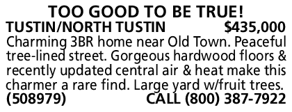 TUSTIN/NORTH TUSTIN $435,000 Charming 3BR home near Old Town. Peaceful tree-lined street. Gorgeous hardwood floors & recently updated central air & heat make this charmer a rare find. Large yard w/fruit trees. (508979) CALL (800) 387-7922