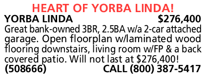 YORBA LINDA $276,400 Great bank-owned 3BR, 2.5BA w/a 2-car attached garage. Open floorplan w/laminated wood flooring downstairs, living room w/FP & a back covered patio. Will not last at $276,400! (508666) CALL (800) 387-5417