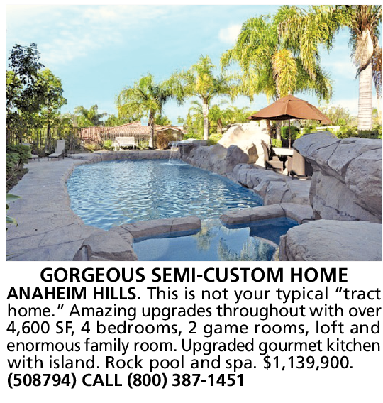 GORGEOUS SEMI-CUSTOM HOME ANAHEIM HILLS. This is not your typical “tract home.” Amazing upgrades throughout with over 4,600 SF, 4 bedrooms, 2 game rooms, loft and enormous family room. Upgraded gourmet kitchen with island. Rock pool and spa. $1,139,900. (508794) CALL (800) 387-1451