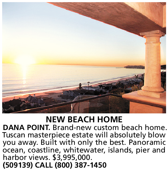 NEW BEACH HOME DANA POINT. Brand-new custom beach home. Tuscan masterpiece estate will absolutely blow you away. Built with only the best. Panoramic ocean, coastline, whitewater, islands, pier and harbor views. $3,995,000. (509139) CALL (800) 387-1450