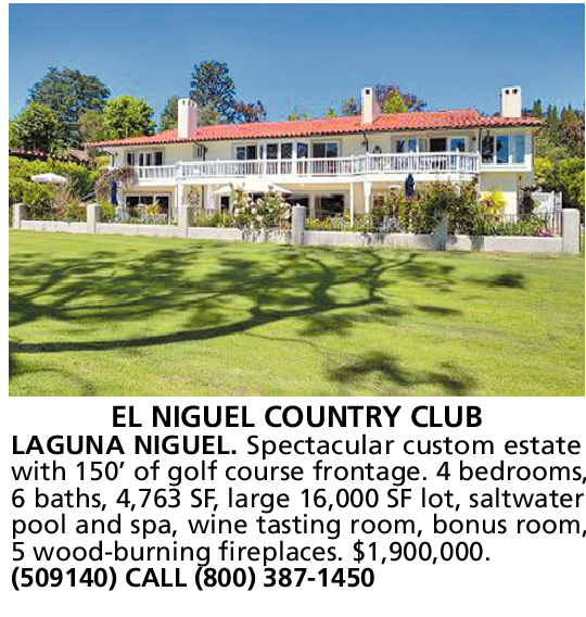 EL NIGUEL COUNTRY CLUB LAGUNA NIGUEL. Spectacular custom estate with 150’ of golf course frontage. 4 bedrooms, 6 baths, 4,763 SF, large 16,000 SF lot, saltwater pool and spa, wine tasting room, bonus room, 5 wood-burning fireplaces. $1,900,000. (509140) CALL (800) 387-1450