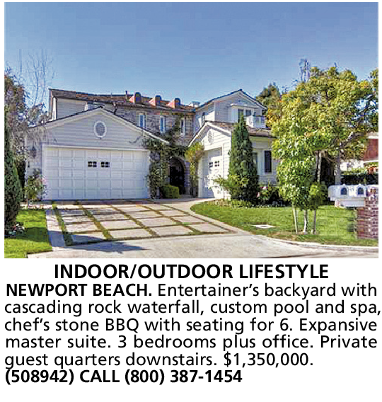 INDOOR/OUTDOOR LIFESTYLE NEWPORT BEACH. Entertainer’s backyard with cascading rock waterfall, custom pool and spa, chef’s stone BBQ with seating for 6. Expansive master suite. 3 bedrooms plus office. Private guest quarters downstairs. $1,350,000. (508942) CALL (800) 387-1454