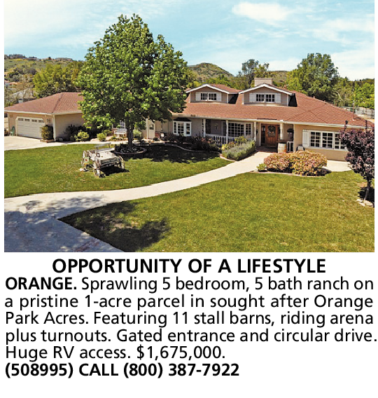 OPPORTUNITY OF A LIFESTYLE ORANGE. Sprawling 5 bedroom, 5 bath ranch on a pristine 1-acre parcel in sought after Orange Park Acres. Featuring 11 stall barns, riding arena plus turnouts. Gated entrance and circular drive. Huge RV access. $1,675,000. (508995) CALL (800) 387-7922