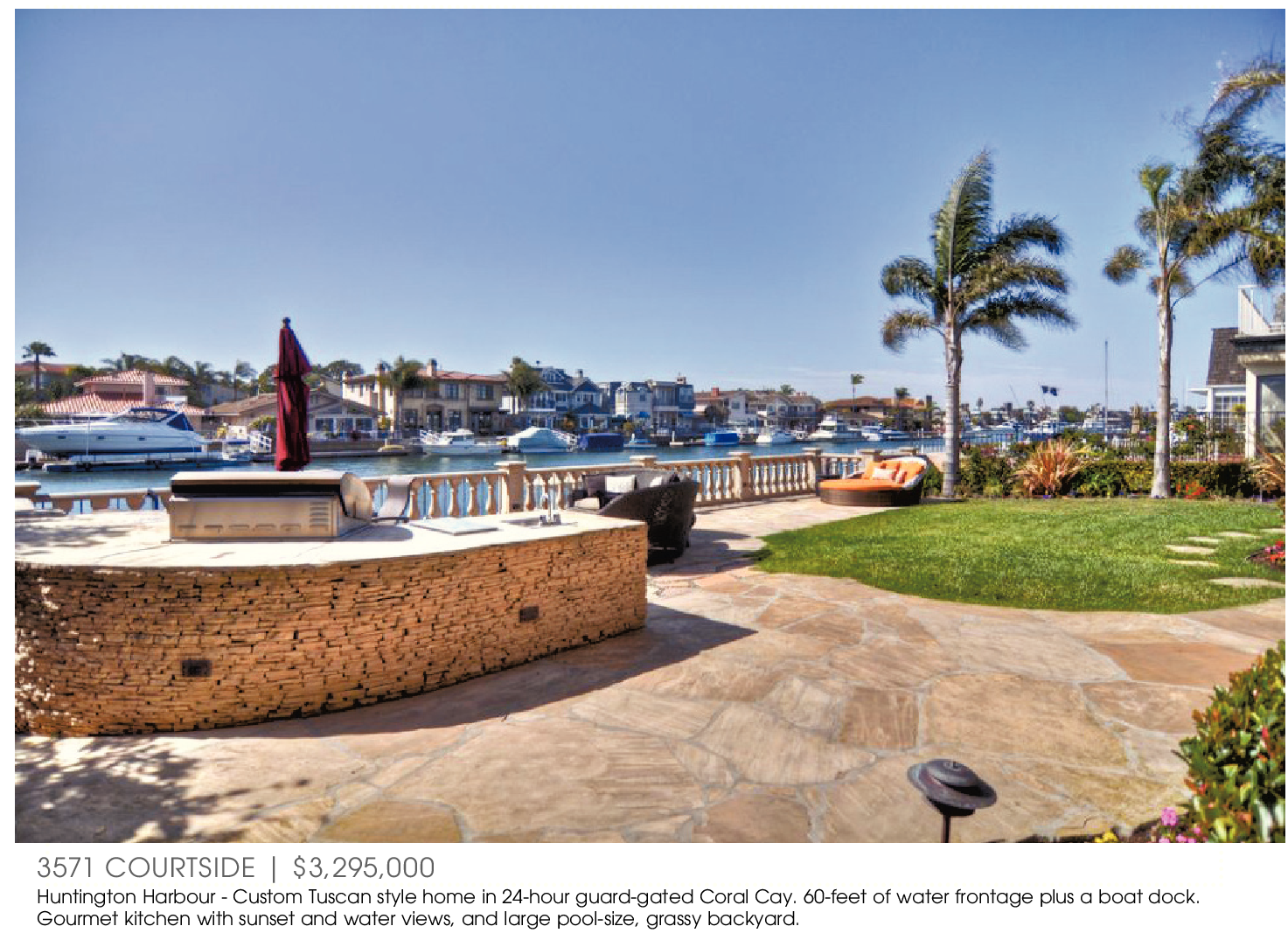 3571 COURTSIDE | $3,295,000 Huntington Harbour - Custom Tuscan style home in 24-hour guard-gated Coral Cay. 60-feet of water frontage plus a boat dock. Gourmet kitchen with sunset and water views, and large pool-size, grassy backyard.
