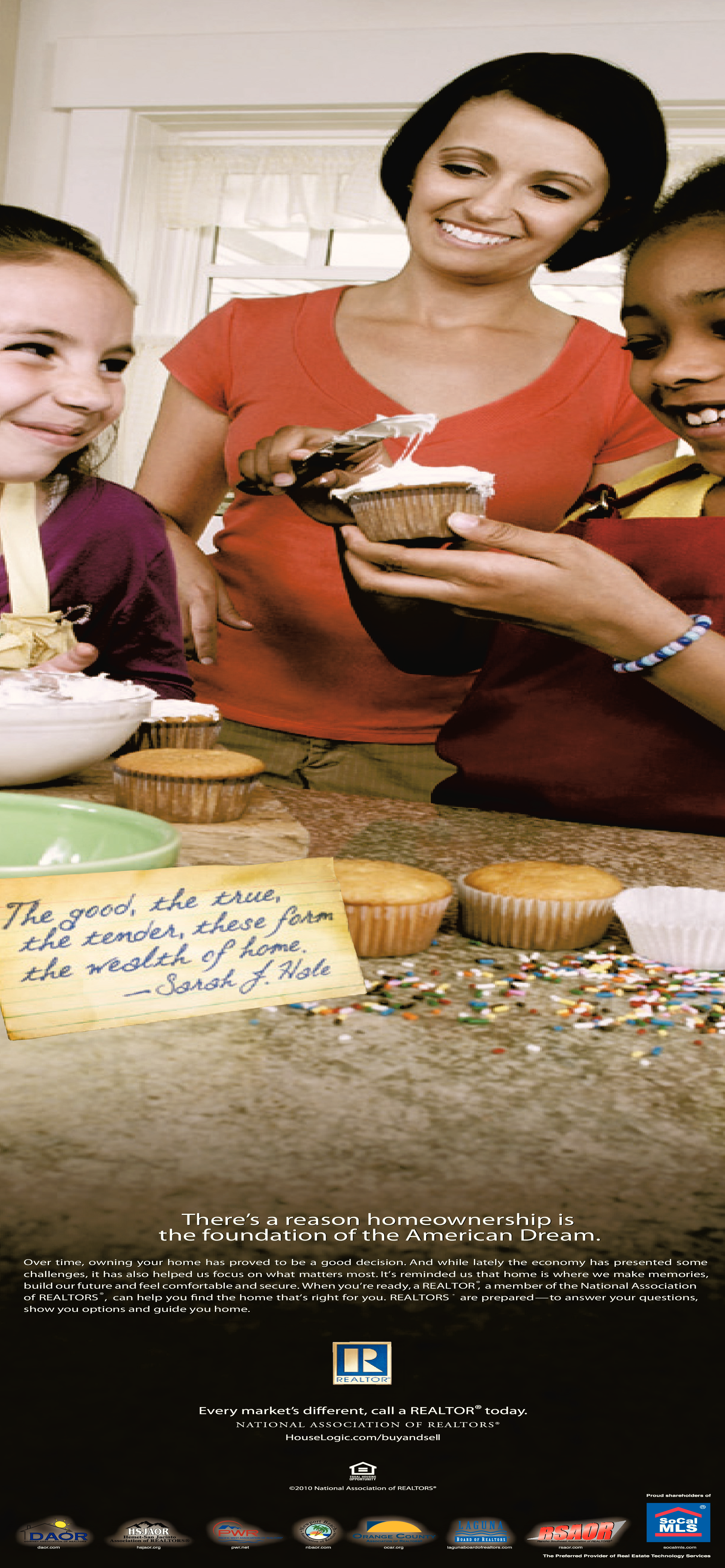JS4 SUNDAY, JULY 31, 2011 OC LOS ANGELES TIMES There’s a reason homeownership is the foundation of the American Dream. Over time, owning your home has proved to be a good decision. And while lately the economy has presented some challenges, it has also helped us focus on what matters most. It’s reminded us that home is where we make memories, build our future and feel comfortable and secure. When you’re ready, a REALTOR ® , a member of the National Association of REALTORS ® , can help you find the home that’s right for you. REALTORS ® are prepared—to answer your questions, show you options and guide you home.