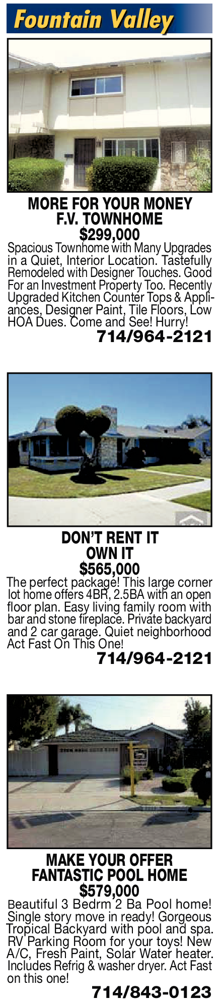 MORE FOR YOUR MONEY F.V. TOWNHOME $299,000 Spacious Townhome with Many Upgrades in a Quiet, Interior Location. Tastefully Remodeled with Designer Touches. Good For an Investment Property Too. Recently Upgraded Kitchen Counter Tops & Appliances, Designer Paint, Tile Floors, Low HOA Dues. Come and See! Hurry!