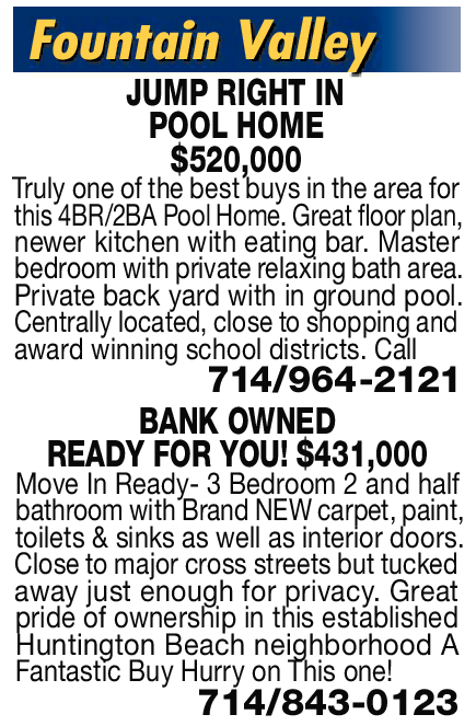 Centrally located, close to shopping and award winning school districts. Call 714/964-2121 BANK OWNED READY FOR YOU! $431,000 Move In Ready- 3 Bedroom 2 and half bathroom with Brand NEW carpet, paint, toilets & sinks as well as interior doors. Close to major cross streets but tucked away just enough for privacy. Great pride of ownership in this established Huntington Beach neighborhood A Fantastic Buy Hurry on This one!