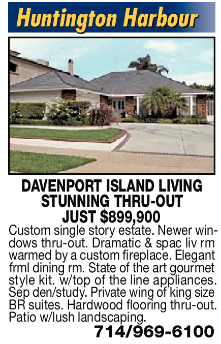 Huntington Harbour DAVENPORT ISLAND LIVING STUNNING THRU-OUT JUST $899,900 Custom single story estate. Newer windows thru-out. Dramatic & spac liv rm warmed by a custom fireplace. Elegant frml dining rm. State of the art gourmet style kit. w/top of the line appliances. Sep den/study. Private wing of king size BR suites. Hardwood flooring thru-out. Patio w/lush landscaping. 714/969-6100