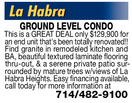 GROUND LEVEL CONDO This is a GREAT DEAL only $129,900 for an end unit that's been totally renovated!! Find granite in remodeled kitchen and BA, beautiful textured laminate fl ooring thru-out, & a serene private patio surrounded by mature trees w/views of La Habra Heights. Easy financing available, call today for more information at 714/482-9100
