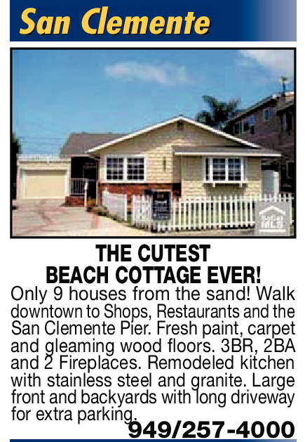 Only 9 houses from the sand! Walk downtown to Shops, Restaurants and the San Clemente Pier. Fresh paint, carpet and gleaming wood floors. 3BR, 2BA and 2 Fireplaces. Remodeled kitchen with stainless steel and granite. Large front and backyards with long driveway for extra parking. 949/257-4000