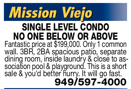 Mission Viejo SINGLE LEVEL CONDO NO ONE BELOW OR ABOVE Fantastic price at $199,000. Only 1 common wall. 3BR, 2BA spacious patio, separate dining room, inside laundry & close to association pool & playground. This is a short sale & you'd better hurry. It will go fast. 949/597-4000 See also