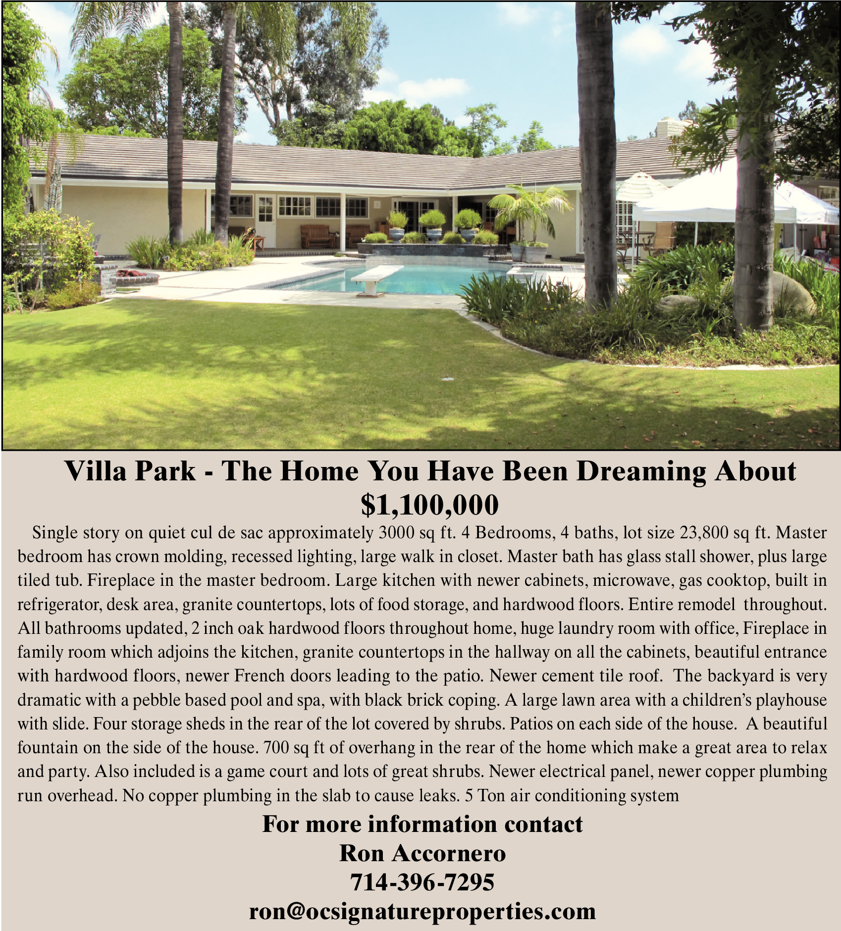 Villa Park - The Home You Have Been Dreaming About $1,100,000 Single story on quiet cul de sac approximately 3000 sq ft. 4 Bedrooms, 4 baths, lot size 23,800 sq ft. Master bedroom has crown molding, recessed lighting, large walk in closet. Master bath has glass stall shower, plus large tiled tub. Fireplace in the master bedroom. Large kitchen with newer cabinets, microwave, gas cooktop, built in refrigerator, desk area, granite countertops, lots of food storage, and hardwood floors. Entire remodel throughout. All bathrooms updated, 2 inch oak hardwood floors throughout home, huge laundry room with office, Fireplace in family room which adjoins the kitchen, granite countertops in the hallway on all the cabinets, beautiful entrance with hardwood floors, newer French doors leading to the patio. Newer cement tile roof. The backyard is very dramatic with a pebble based pool and spa, with black brick coping. A large lawn area with a children’s playhouse with slide. Four storage sheds in the rear of the lot covered by shrubs. Patios on each side of the house. A beautiful fountain on the side of the house. 700 sq ft of overhang in the rear of the home which make a great area to relax and party. Also included is a game court and lots of great shrubs. Newer electrical panel, newer copper plumbing run overhead. No copper plumbing in the slab to cause leaks. 5 Ton air conditioning system For more information contact Ron Accornero 714-396-7295 ron@ocsignatureproperties.com