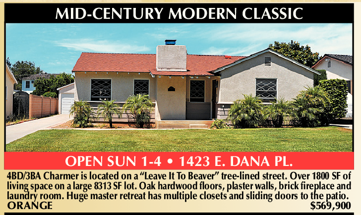 MID-CENTURY MODERN CLASSIC OPEN SUN 1-4 • 1423 E. DANA PL. 4BD/3BA Charmer is located on a “Leave It To Beaver” tree-lined street. Over 1800 SF of living space on a large 8313 SF lot. Oak hardwood floors, plaster walls, brick fireplace and laundry room. Huge master retreat has multiple closets and sliding doors to the patio. ORANGE $569,900