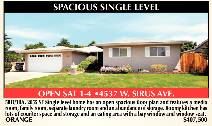 SPACIOUS SINGLE LEVEL OPEN SAT 1-4 •4537 W. SIRUS AVE. 5BD/3BA, 2055 SF Single level home has an open spacious floor plan and features a media room, family room, separate laundry room and an abundance of storage. Roomy kitchen has lots of counter space and storage and an eating area with a bay window and window seat. ORANGE $407,500 DON'T MAKE A MOVE WITHOUT US!