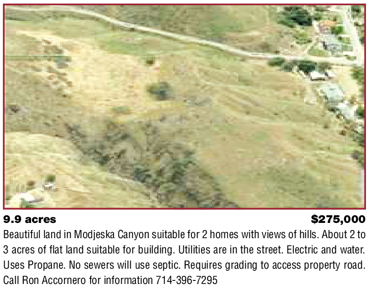 9.9 acres $275,000 Beautiful land in Modjeska Canyon suitable for 2 homes with views of hills. About 2 to 3 acres of flat land suitable for building. Utilities are in the street. Electric and water. Uses Propane. No sewers will use septic. Requires grading to access property road. Call Ron Accornero for information 714-396-7295