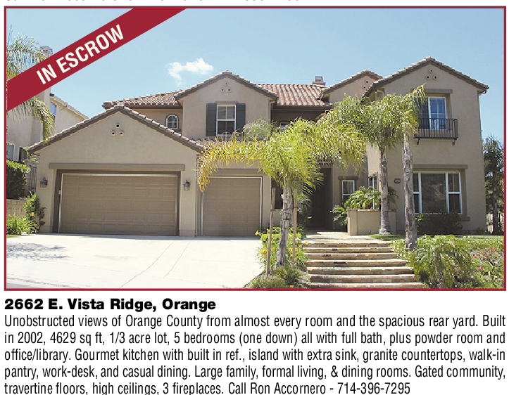 2662 E. Vista Ridge, Orange Unobstructed views of Orange County from almost every room and the spacious rear yard. Built in 2002, 4629 sq ft, 1/3 acre lot, 5 bedrooms (one down) all with full bath, plus powder room and office/library. Gourmet kitchen with built in ref., island with extra sink, granite countertops, walk-in pantry, work-desk, and casual dining. Large family, formal living, & dining rooms. Gated community, travertine floors, high ceilings, 3 fireplaces. Call Ron Accornero - 714-396-7295