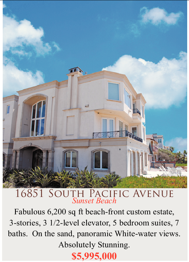 Sunset Beach Fabulous 6,200 sq ft beach-front custom estate, 3-stories, 3 1/2-level elevator, 5 bedroom suites, 7 baths. On the sand, panoramic White-water views.