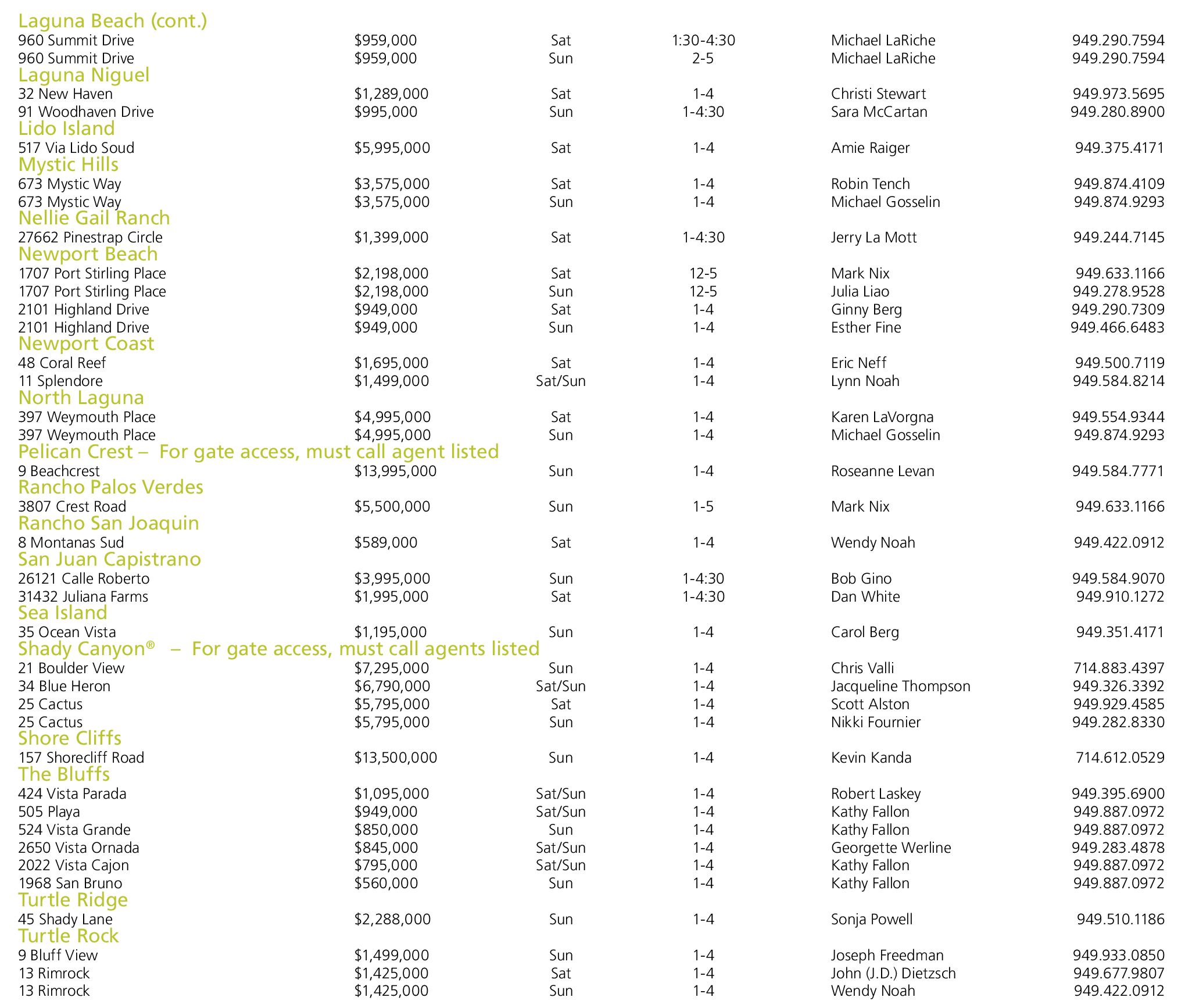 Laguna Beach (cont.) 960 Summit Drive $959,000 Sat 1:30-4:30 Michael LaRiche 949.290.7594 960 Summit Drive $959,000 Sun 2-5 Michael LaRiche 949.290.7594 Laguna Niguel 32 New Haven $1,289,000 Sat 1-4 Christi Stewart 949.973.5695 91 Woodhaven Drive $995,000 Sun 1-4:30 Sara McCartan 949.280.8900 Lido Island 517 Via Lido Soud $5,995,000 Sat 1-4 Amie Raiger 949.375.4171 Mystic Hills 673 Mystic Way $3,575,000 Sat 1-4 Robin Tench 949.874.4109 673 Mystic Way $3,575,000 Sun 1-4 Michael Gosselin 949.874.9293 Nellie Gail Ranch 27662 Pinestrap Circle $1,399,000 Sat 1-4:30 Jerry La Mott 949.244.7145 Newport Beach 1707 Port Stirling Place $2,198,000 Sat 12-5 Mark Nix 949.633.1166 1707 Port Stirling Place $2,198,000 Sun 12-5 Julia Liao 949.278.9528 2101 Highland Drive $949,000 Sat 1-4 Ginny Berg 949.290.7309 2101 Highland Drive $949,000 Sun 1-4 Esther Fine 949.466.6483 Newport Coast 48 Coral Reef $1,695,000 Sat 1-4 Eric Neff 949.500.7119 11 Splendore $1,499,000 Sat/Sun 1-4 Lynn Noah 949.584.8214 North Laguna 397 Weymouth Place $4,995,000 Sat 1-4 Karen LaVorgna 949.554.9344 397 Weymouth Place $4,995,000 Sun 1-4 Michael Gosselin 949.874.9293 Pelican Crest – For gate access, must call agent listed 9 Beachcrest $13,995,000 Sun 1-4 Roseanne Levan 949.584.7771 Rancho Palos Verdes 3807 Crest Road $5,500,000 Sun 1-5 Mark Nix 949.633.1166 Rancho San Joaquin 8 Montanas Sud $589,000 Sat 1-4 Wendy Noah 949.422.0912 San Juan Capistrano 26121 Calle Roberto $3,995,000 Sun 1-4:30 Bob Gino 949.584.9070 31432 Juliana Farms $1,995,000 Sat 1-4:30 Dan White 949.910.1272 Sea Island 35 Ocean Vista $1,195,000 Sun 1-4 Carol Berg 949.351.4171 Shady Canyon ® – For gate access, must call agents listed 21 Boulder View $7,295,000 Sun 1-4 Chris Valli 714.883.4397 34 Blue Heron $6,790,000 Sat/Sun 1-4 Jacqueline Thompson 949.326.3392 25 Cactus $5,795,000 Sat 1-4 Scott Alston 949.929.4585 25 Cactus $5,795,000 Sun 1-4 Nikki Fournier 949.282.8330 Shore Cliffs 157 Shorecliff Road $13,500,000 Sun 1-4 Kevin Kanda 714.612.0529 The Bluffs 424 Vista Parada $1,095,000 Sat/Sun 1-4 Robert Laskey 949.395.6900 505 Playa $949,000 Sat/Sun 1-4 Kathy Fallon 949.887.0972 524 Vista Grande $850,000 Sun 1-4 Kathy Fallon 949.887.0972 2650 Vista Ornada $845,000 Sat/Sun 1-4 Georgette Werline 949.283.4878 2022 Vista Cajon $795,000 Sat/Sun 1-4 Kathy Fallon 949.887.0972 1968 San Bruno $560,000 Sun 1-4 Kathy Fallon 949.887.0972 Turtle Ridge 45 Shady Lane $2,288,000 Sun 1-4 Sonja Powell 949.510.1186 Turtle Rock 9 Bluff View $1,499,000 Sun 1-4 Joseph Freedman 949.933.0850 13 Rimrock $1,425,000 Sat 1-4 John (J.D.) Dietzsch 949.677.9807 13 Rimrock $1,425,000 Sun 1-4 Wendy Noah 949.422.0912
