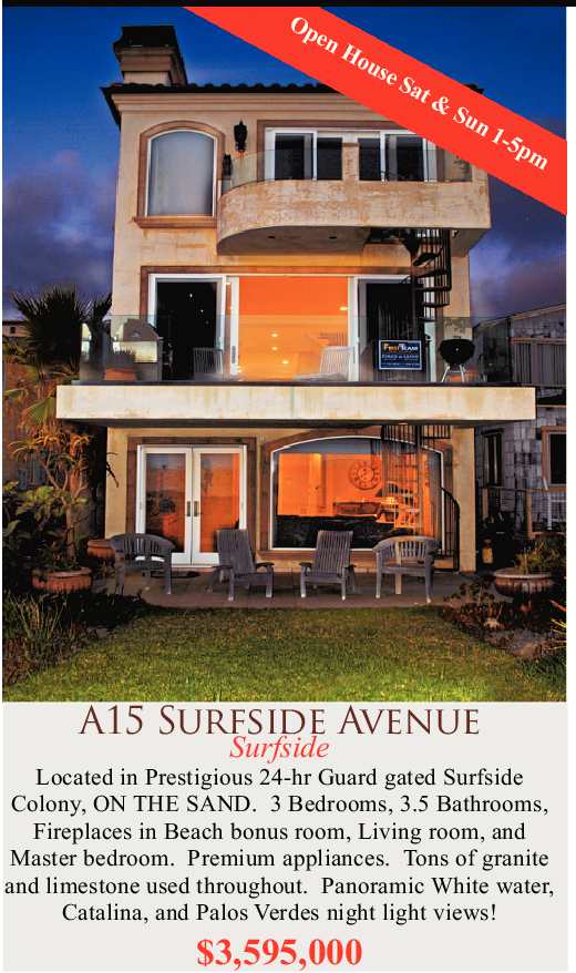 Surfside Located in Prestigious 24-hr Guard gated Surfside Colony, ON THE SAND. 3 Bedrooms, 3.5 Bathrooms, Fireplaces in Beach bonus room, Living room, and Master bedroom. Premium appliances. Tons of granite and limestone used throughout. Panoramic White water, Catalina, and Palos Verdes night light views!