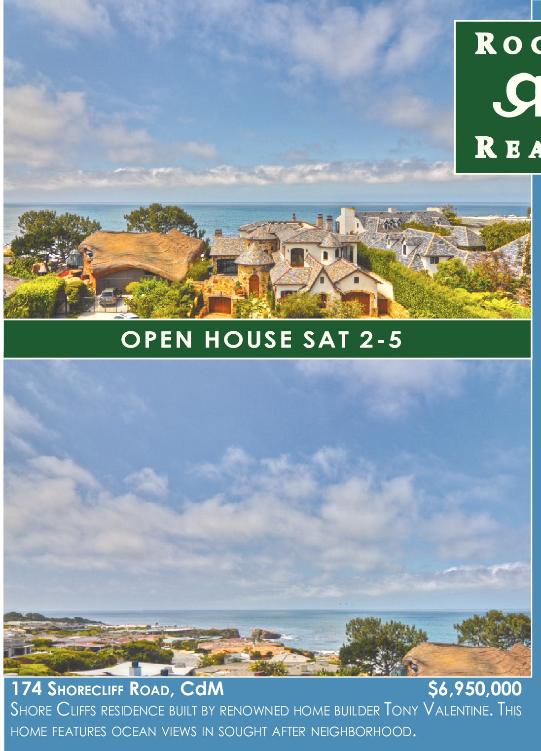 LUXURY RESIDENCE NESTLED ON ONE OF THE MOST PRIVATE OCEAN VIEWS. THIS HOME OFFERS OPEN HOUSE SAT 2-5 174 SHORECLIFF ROAD, CdM $6,950,000 SHORE CLIFFS RESIDENCE BUILT BY RENOWNED HOME BUILDER TONY VALENTINE. THIS HOME FEATURES OCEAN VIEWS IN SOUGHT AFTER NEIGHBORHOOD. See also