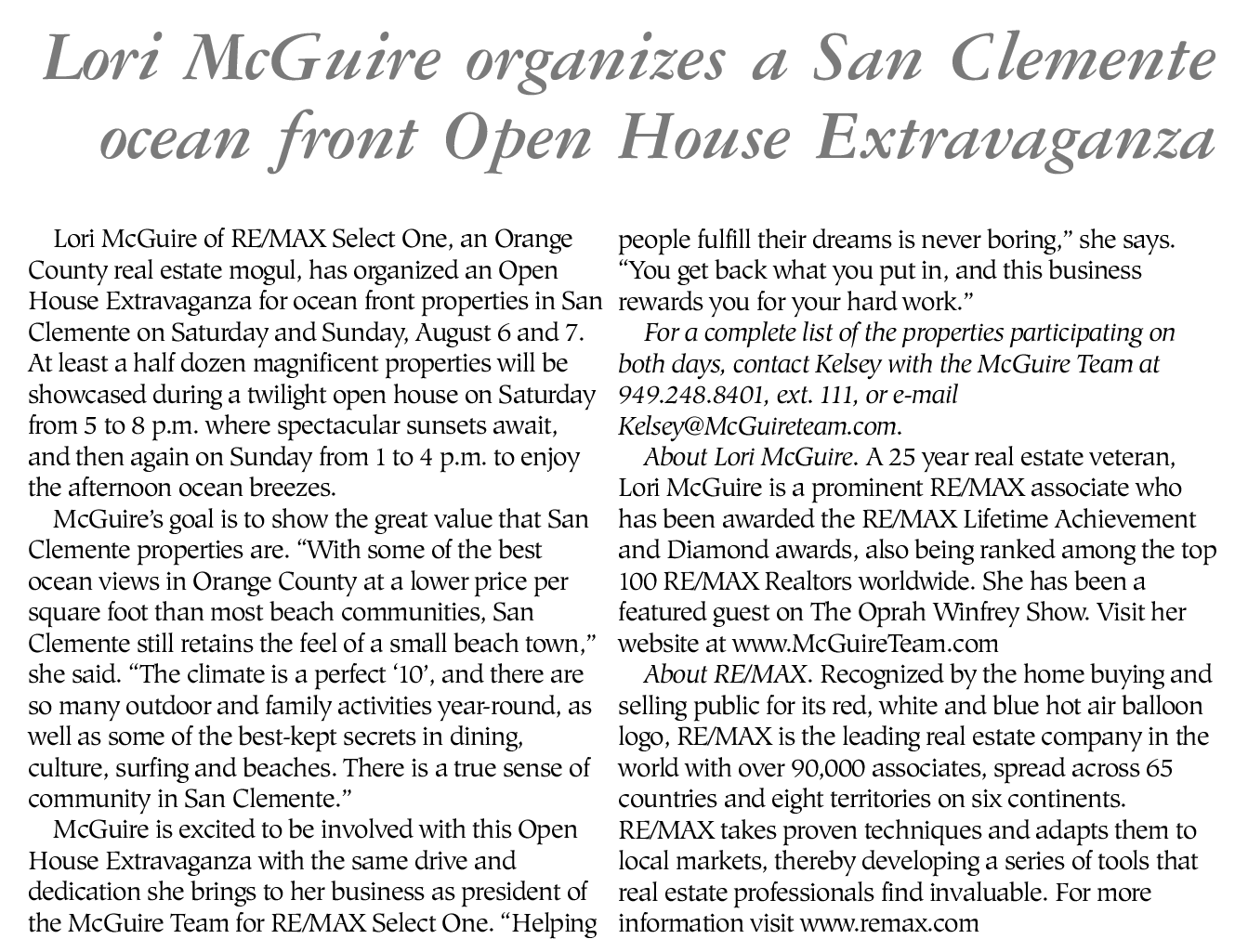 Lori McGuire of RE/MAX Select One, an Orange County real estate mogul, has organized an Open House Extravaganza for ocean front properties in San Clemente on Saturday and Sunday, August 6 and 7. At least a half dozen magnificent properties will be showcased during a twilight open house on Saturday from 5 to 8 p.m. where spectacular sunsets await, and then again on Sunday from 1 to 4 p.m. to enjoy the afternoon ocean breezes.