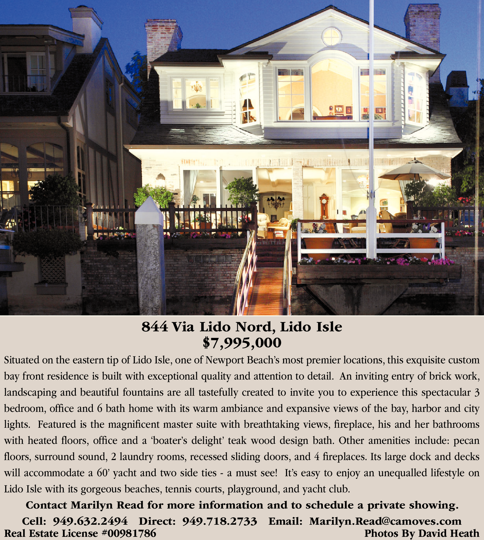 844 Via Lido Nord, Lido Isle $7,995,000 Situated on the eastern tip of Lido Isle, one of Newport Beach’s most premier locations, this exquisite custom bay front residence is built with exceptional quality and attention to detail. An inviting entry of brick work, landscaping and beautiful fountains are all tastefully created to invite you to experience this spectacular 3 bedroom, office and 6 bath home with its warm ambiance and expansive views of the bay, harbor and city lights. Featured is the magnificent master suite with breathtaking views, fireplace, his and her bathrooms with heated floors, office and a ‘boater’s delight’ teak wood design bath. Other amenities include: pecan floors, surround sound, 2 laundry rooms, recessed sliding doors, and 4 fireplaces. Its large dock and decks will accommodate a 60’ yacht and two side ties - a must see! It’s easy to enjoy an unequalled lifestyle on Lido Isle with its gorgeous beaches, tennis courts, playground, and yacht club. Contact Marilyn Read for more information and to schedule a private showing. Cell: 949.632.2494 Direct: 949.718.2733 Email: Marilyn.Read@camoves.com Real Estate License #00981786 Photos By David Heath
