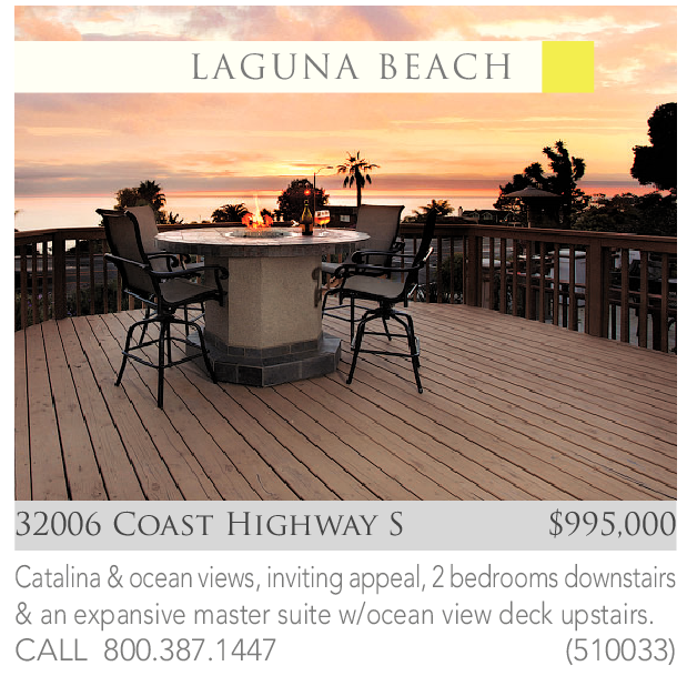 32006 Coast Highway S $995,000 Catalina & ocean views, inviting appeal, 2 bedrooms downstairs & an expansive master suite w/ocean view deck upstairs. CALL 800.387.1447 (510033)