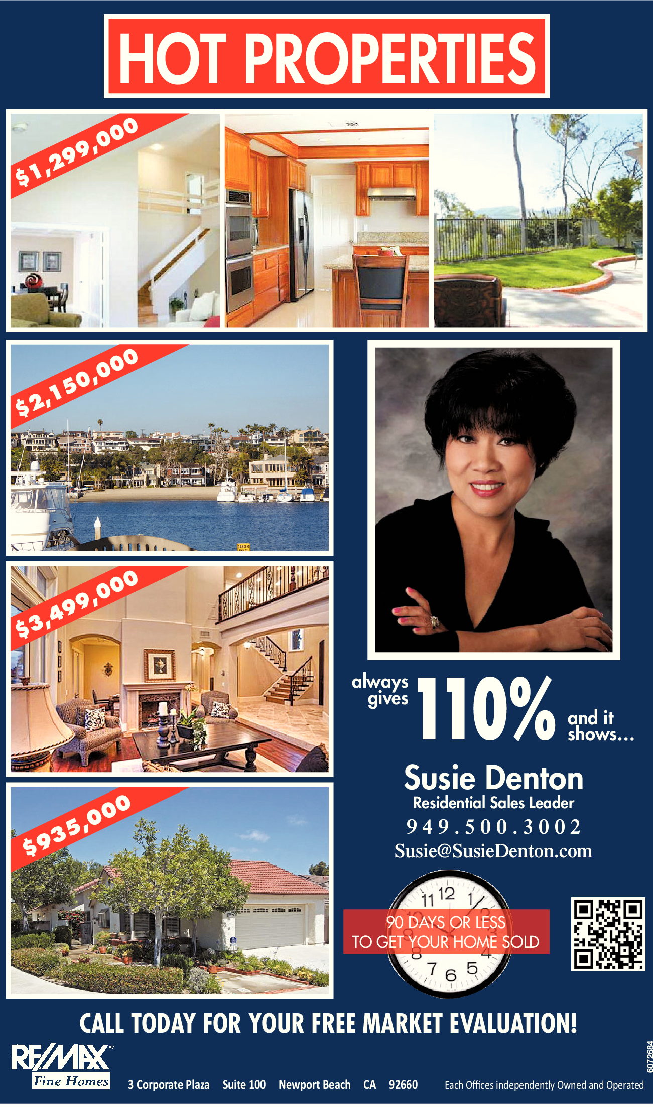 HOT PROPERTIES always 110% gives Susie Denton Residential Sales Leader 9 4 9 . 5 0 0 . 3 0 0 2 Susie@SusieDenton.com 90 DAYS OR LESS TO GET YOUR HOME SOLD CALL TODAY FOR YOUR FREE MARKET EVALUATION! and it shows… 3 Corporate Plaza Suite 100 Newport Beach CA 92660 Each Offices independently Owned and Operated