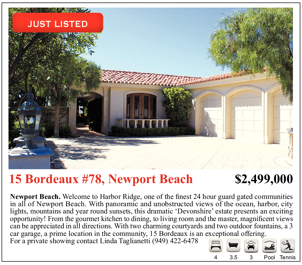 Newport Beach. Welcome to Harbor Ridge, one of the finest 24 hour guard gated communities in all of Newport Beach. With panoramic and unobstructed views of the ocean, harbor, city lights, mountains and year round sunsets, this dramatic ‘Devonshire’ estate presents an exciting opportunity! From the gourmet kitchen to dining, to living room and the master, magnificent views can be appreciated in all directions. With two charming courtyards and two outdoor fountains, a 3 car garage, a prime location in the community, 15 Bordeaux is an exceptional offering. For a private showing contact Linda Taglianetti (949) 422-6478