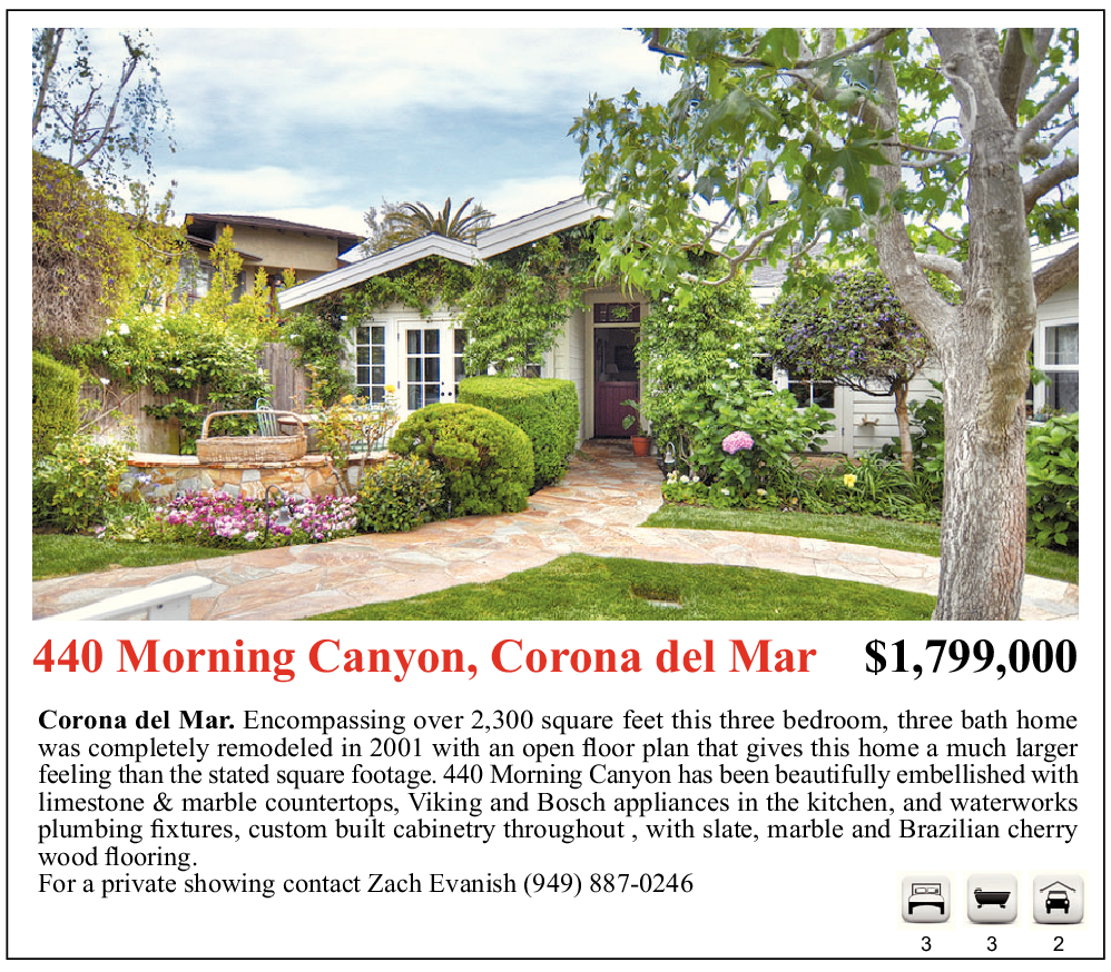 Corona del Mar. Encompassing over 2,300 square feet this three bedroom, three bath home was completely remodeled in 2001 with an open floor plan that gives this home a much larger feeling than the stated square footage. 440 Morning Canyon has been beautifully embellished with limestone & marble countertops, Viking and Bosch appliances in the kitchen, and waterworks plumbing fixtures, custom built cabinetry throughout , with slate, marble and Brazilian cherry wood flooring. For a private showing contact Zach Evanish (949) 887-0246