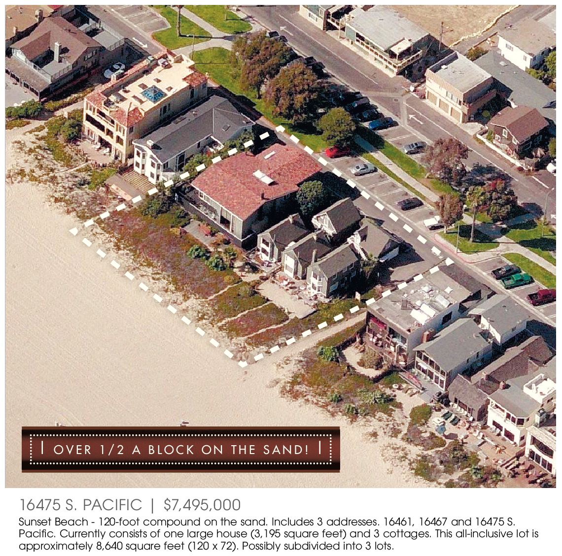 16475 S. PACIFIC | $7,495,000 Sunset Beach - 120-foot compound on the sand. Includes 3 addresses. 16461, 16467 and 16475 S. Pacific. Currently consists of one large house (3,195 square feet) and 3 cottages. This all-inclusive lot is approximately 8,640 square feet (120 x 72). Possibly subdivided into 3 lots.
