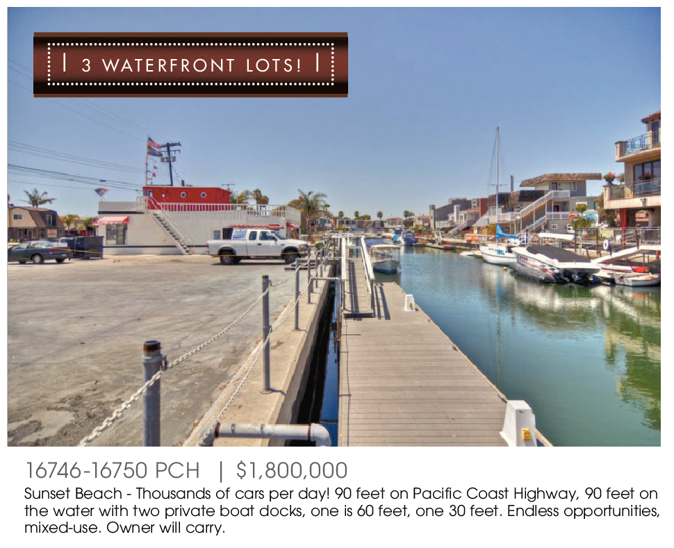 | 3 WATERFRONT LOTS! | 16746-16750 PCH | $1,800,000 Sunset Beach - Thousands of cars per day! 90 feet on Pacific Coast Highway, 90 feet on the water with two private boat docks, one is 60 feet, one 30 feet. Endless opportunities, mixed-use. Owner will carry.